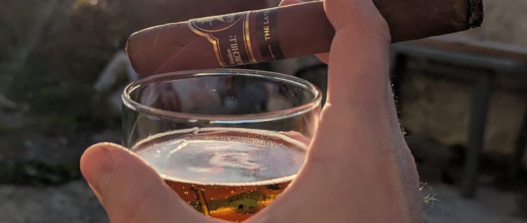 The bold, cask-aged Davidoff Winston Churchill Late Hour pairs surprisingly well with the crisp sweetness of Henry Westons Vintage Cider, creating a balance of power and freshness.